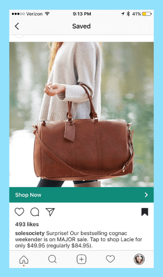 Take @solesociety for example. In the example below, they use “Surprise!” followed by a short product description to reel people in. And then they use “tap to shop” as a call-to-action to encourage users to make a purchase.