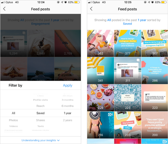 One way to do it is by looking at your Instagram Insights — under the Content tab, if you tap “See All” under Feed Posts, you can use the filter option to analyze your post-performance based on the number of saves it got: