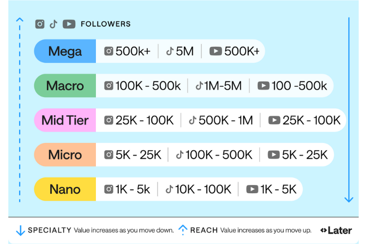 Nano Influencers: 1k-5k on YouTube or Instagram, or 10k-100k on TikTok