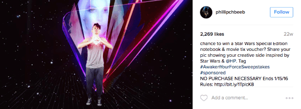 In one campaign, HP asked their Instagram influencers, a mix of musicians, artists and tech professionals, to promote the #AwakenYourForce sweepstakes, which offered followers a chance to win a Star Wars Special Edition notebook and a movie ticket voucher. The influencers shared galactic-inspired posts with a dedicated Bitly link in the caption that drove to the sweepstakes landing page.
