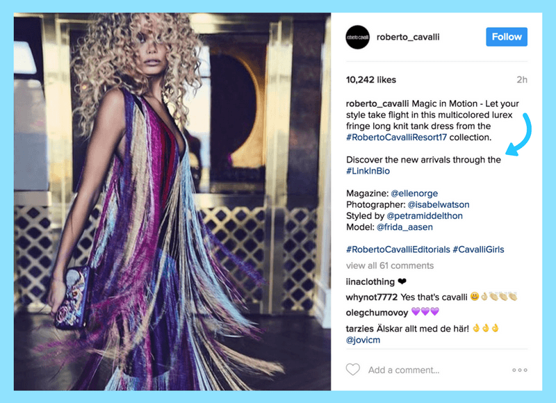 But the hard work doesn’t end once you’ve taken that gorgeous Instagram photo and edited it to perfection. The caption of your post is where you can give a voice to that visual content, and ask your followers to take action by either visiting your site or buying a product. For example, fashion designer Roberto Cavalli often posts captions that direct viewers to check out new products by clicking the link in their bio.