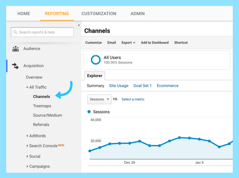To view your report, go to your website profile and click on Acquisition > All Traffic > Channels.