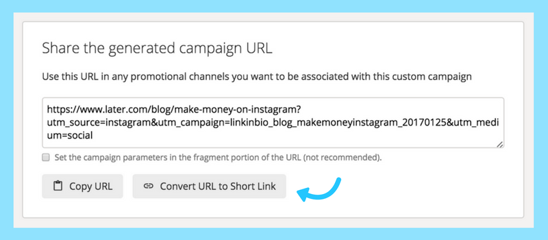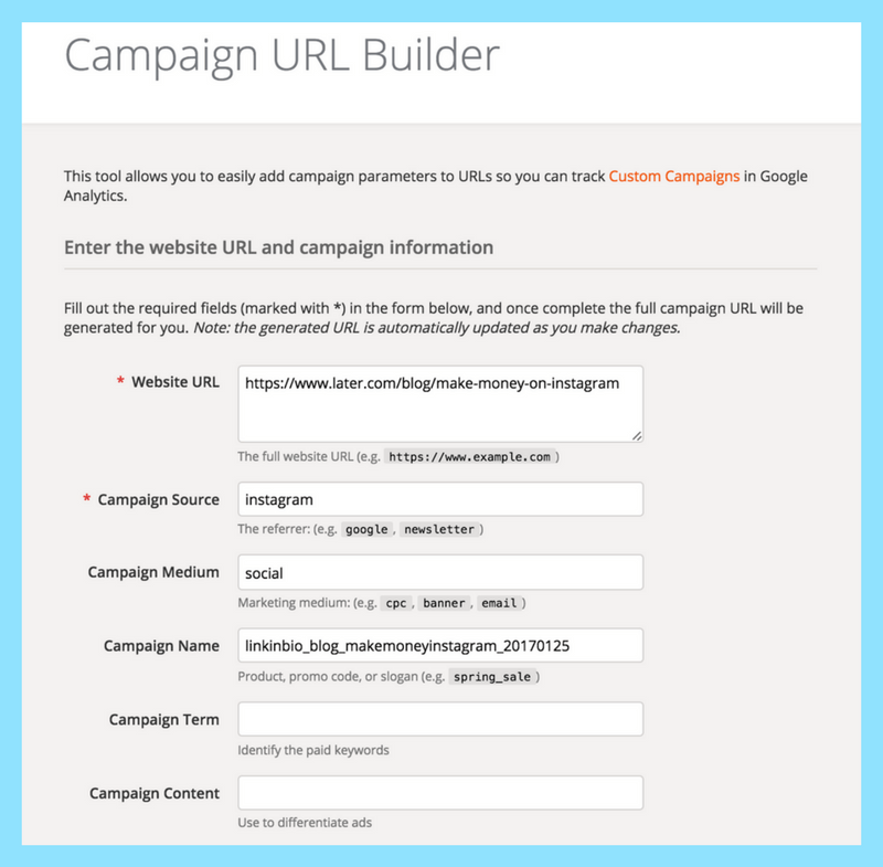 Once you fill in these parameters, Google Analytics will build a URL that you can then place in your Linkin.bio link to track your clicks. You can also shorten the URL if you plan to place it in your Instagram bio.