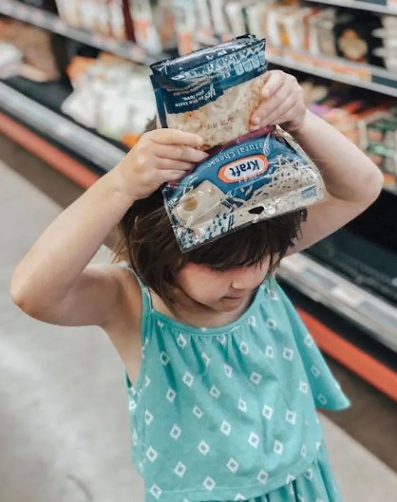 Girl holding bag of Kraft cheese over her head in a grocery store