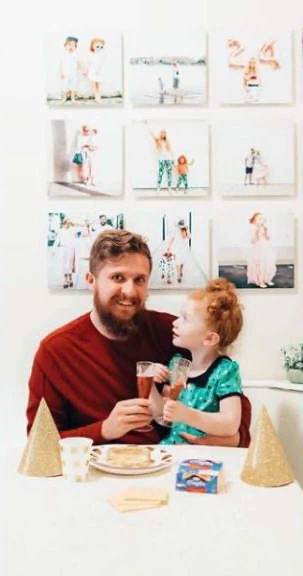 Father and daughter smiling in front of a wall of family photos with Kraft products