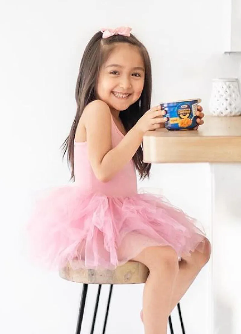 Small child in a tutu sitting at table with Kraft mac and cheese
