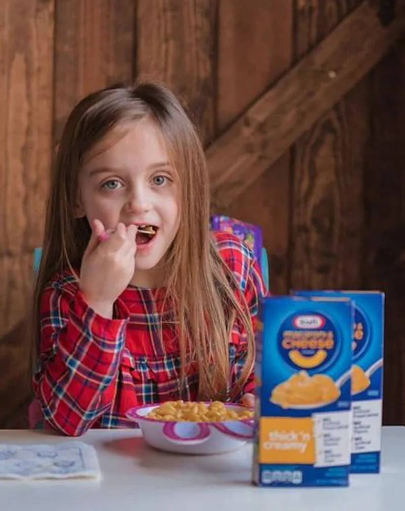 Girl looking into camera while eating a bowl of Kraft mac and cheese