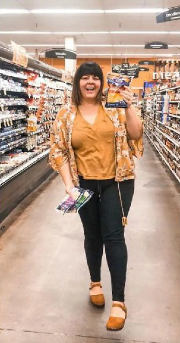 Woman in grocery store posing with Kraft cheeses