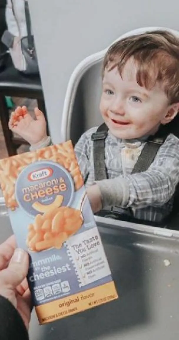 Baby in a highchair with a box of Kraft mac and cheese